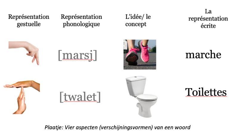 Het plaatje laat de verschillende aspecten van een lexicaal element (woord) zien: het gebaar, de fonetische vorm, het concept en de geschreven vorm. Ideaal is als alle aandacht eerst gaat naar het versterken van de verbinding tussen de eerste drie door voortdurende herhaling (7-10 keer volgens het Spaced Repetition model). Zodra deze verbindingen duurzaam zijn, kan de geschreven vorm worden toegevoegd. AIM-docenten zullen beamen dat de verbinding met dit nieuwe aspect veel sneller duurzaam is dan de andere verbindingen: Leerlingen leren eigenlijk probleemloos en vooral impliciet de spelling doordat ze veelvuldig worden blootgesteld aan de geschreven vorm bij het lezen. En een prachtige bonus is natuurlijk de mooie uitspraak die behouden blijft als de leerlingen eenmaal de geschreven vorm beheersen. Voor een goed leerproces bij vreemde talen is het dus om meerdere redenen goed om met de gesproken variant te beginnen en niet zoveel aandacht te schenken aan een correcte schrijfwijze. Het scheelt veel lestijd en veel frustratie bij leerling en docent waardoor we nog meer met een vreemde taal kunnen doen en bovendien: waardoor de les veel leuker wordt. Maar het zal nog even tijd kosten voordat de gemiddelde docent ook daadwerkelijk de (correcte) geschreven taal los durft te laten. Maar ik weet uit ervaring dat het loont: de lessen worden leuker, leerlingen zijn positiever en het resultaat is beter.